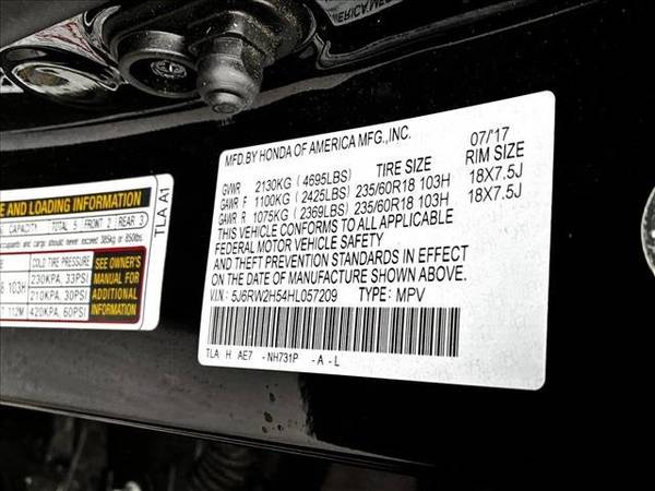 The following items have been reconditioned on this vehicle: new brakes and all new tires! * Moonroof * Lane Keeping Assist * Keyless Start * Rear Spoiler * Black; Cloth Seat Trim * Crystal Black PearlThis vehicle includes a Money-Back Guarantee* and passed our precise inspection process. Best of all the price you see is the price you pay. No haggling. No back and forth. No pressure. And this price is so good it is guaranteed. *Money-Back Guarantee is valid for 5 days or 250 miles, whichever comes first. Subject to certain terms and conditions. See store for details. Some restrictions apply.AutoNation Honda OHare is excited to offer this 2017 Honda CR-V EX. CARFAX shows that this is a one-owner vehicle -- no wonder it's in such great condition. Do so much more with one vehicle. This Honda CR-V gives you everything you need an automobile to be. This 2017 Honda CR-V has great acceleration and wonderful styling without sacrificing exceptional fuel economy. This Honda CR-V EX is equipped with AWD for improved handling. Whether you're faced with inclement weather or just out enjoying the twisting back road, you'll have the grip of AWD on your side. The easiest choice in purchasing your next vehicle is choosing one with a detailed history like this gently driven pre-owned vehicle. Rare is the vehicle that has been driven so gently and maintained so meticulously as this pre-owned beauty. The tires on this vehicle have passed a rigorous inspection for safety, stability and tread life.