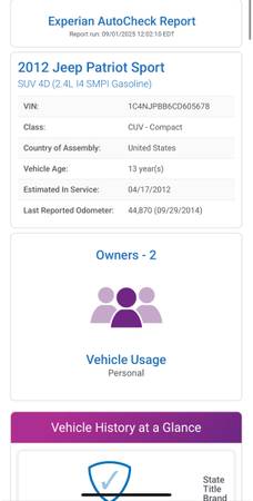 2012 Jeep patriot sport 2.4 L 4-cylinder 157k No mechanical issues Everything works No issues No check engine light Clean title 224-596-168 eight