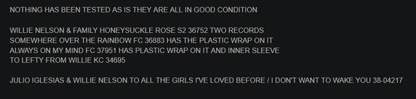 CASH ONLY NOTHING HAS BEEN TESTED AS IS THEY ARE ALL IN GOOD CONDITION WILLIE NELSON & FAMILY HONEYSUCKLE ROSE S2 36752 TWO RECORDS SOMEWHERE OVER THE RAINBOW FC 36883 HAS THE PLASTIC WRAP ON IT...