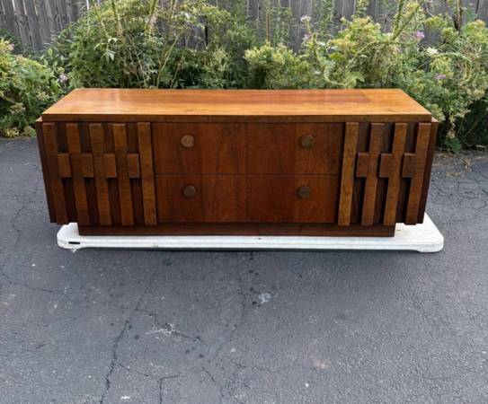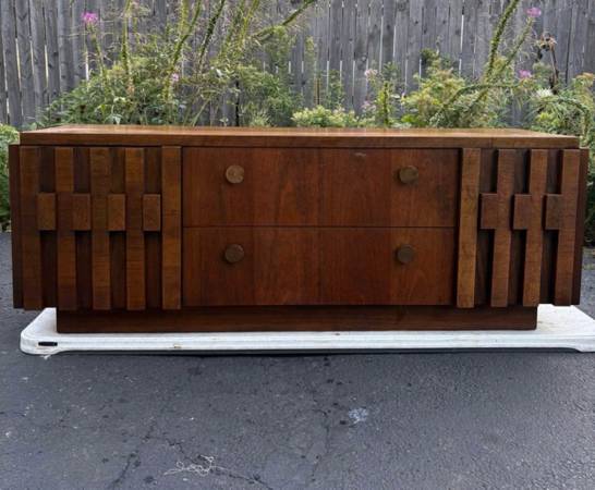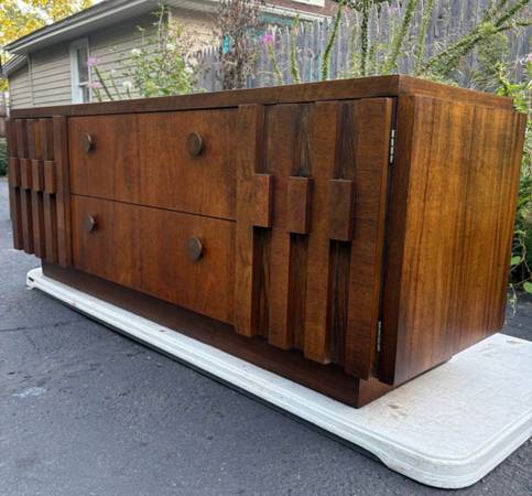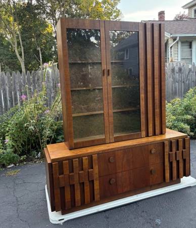 Available LANE AMERICAN MODERN WALNUT CREDENZA CHINA CABINET. SCULPTURAL BLOCK FACADE. This piece shows minimal amount of imperfections from age. It comes in two pieces, if you would like to used it in separate rooms then you will see some fade marks on the credenza top. Please see all pictures and ask any questions you may have about this piece. Delivery is available to all Chicago land and Suburbs.