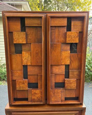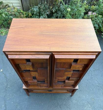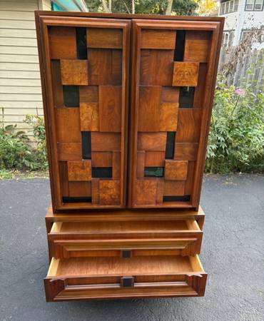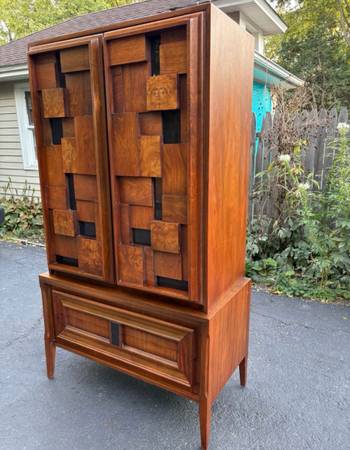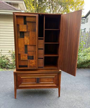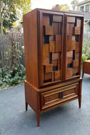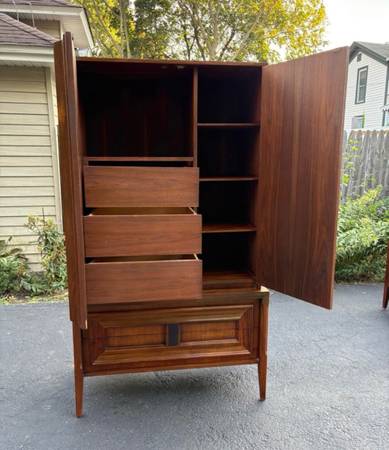 Available Mid Century Modern Armoire/Tall chest Made in Canada. This piece is in excellent condition please see all pictures and ask any questions question you may have about this piece. Delivery is available to all Chicago land and suburbs .The stamp Made in Canada is in the matching nightstand also available.