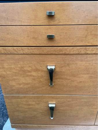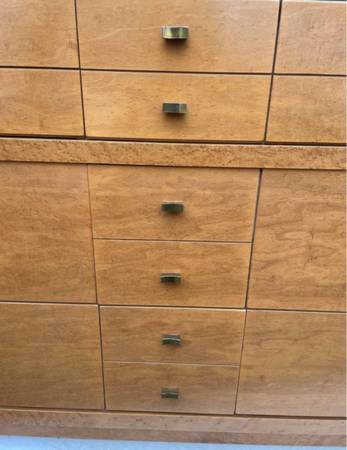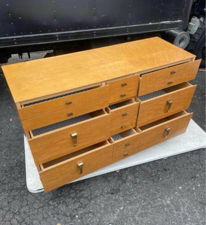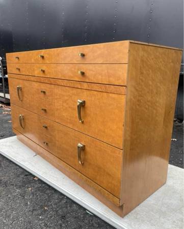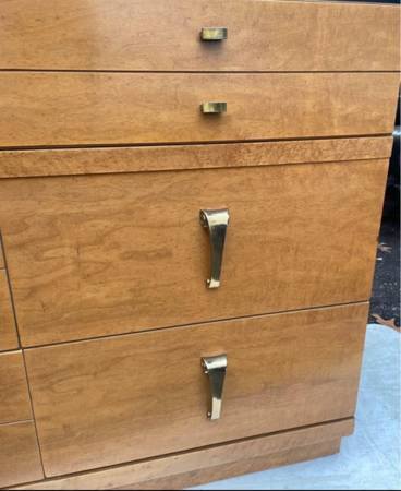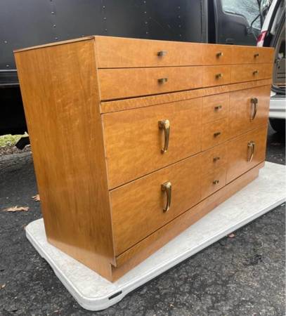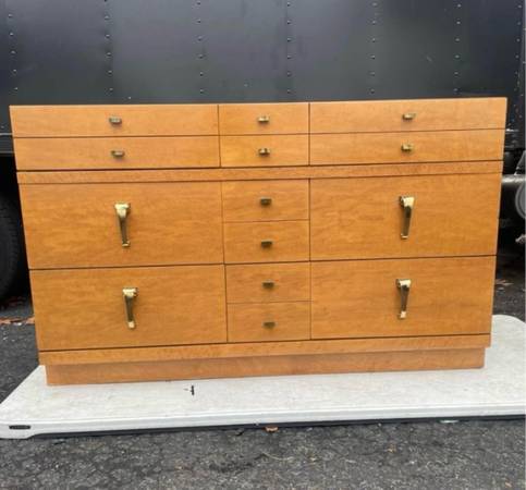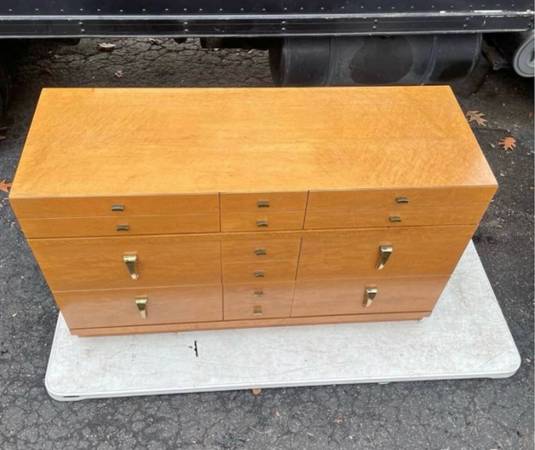 Available Mid Century Modern Birds-Eye Maple 9 Drawer Dresser by United Furniture. This piece is very well made and it shows minimal amount of blemishes from age and from being pre-own. All drawers are dovetailed and work well please see all pictures and ask any questions you may have about this piece. Delivery is available to all Chicago land and suburbs.