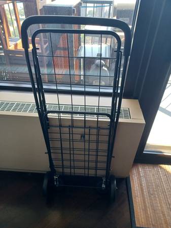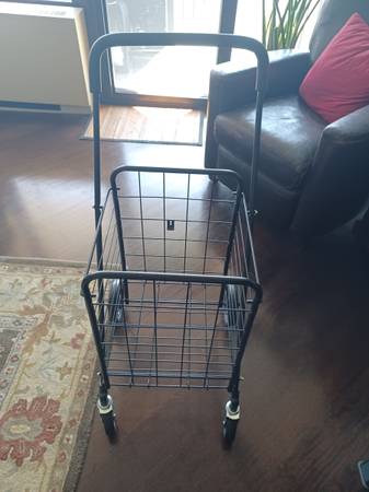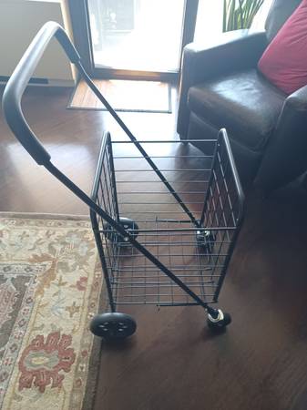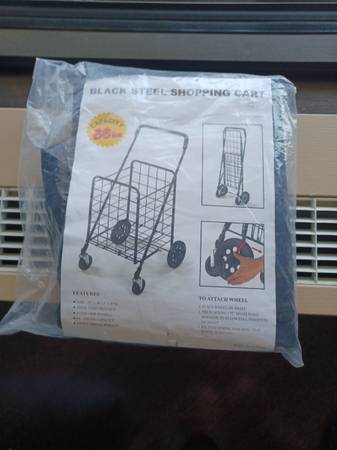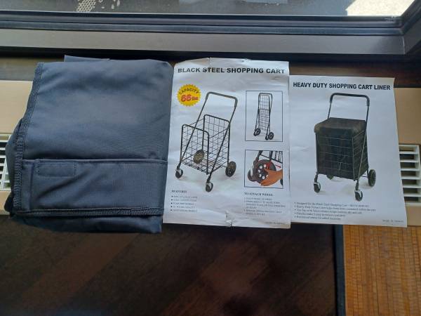 Black Steel Shopping Cart 66lbs Capacity-Fold up Steel Construction-Foam Grip Handle-Front Swivel Wheels & Heavy Duty Shopping Cart Liner- Designed for the Black Steel Shopping Cart liner-Made of Heavy Duty Nylon. Helps keep contents dry & safe. Handles make it easy to remove & carry. It's Brand New, I bought it at the Container Store. Call Michael at show contact info