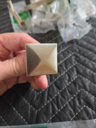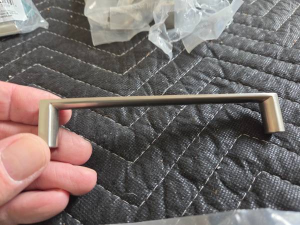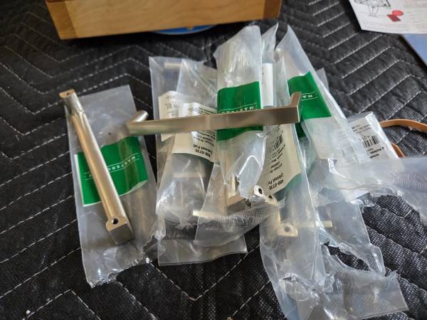 Brushed stainless 5" cabinet pulls with 2 matching knobs. 9 pulls 2 knobs These are new and unused. Came off new cabinet installation