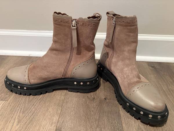 Must see in person to see all the craftsmanship details and textures. The uppers are in suede leather and the front tips and backs are in an etched smooth leather with sawtooth edge trim. The shaft top has scalloped trim. The black rubber 1.75" platform heel has great traction and silver stud embellishments. The interior footbed has a lightly-padded leather sole for comfort. There are inside zippers and pull tabs on the top back for ease in putting on and taking off these boots.