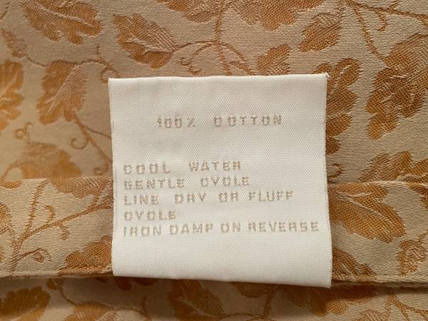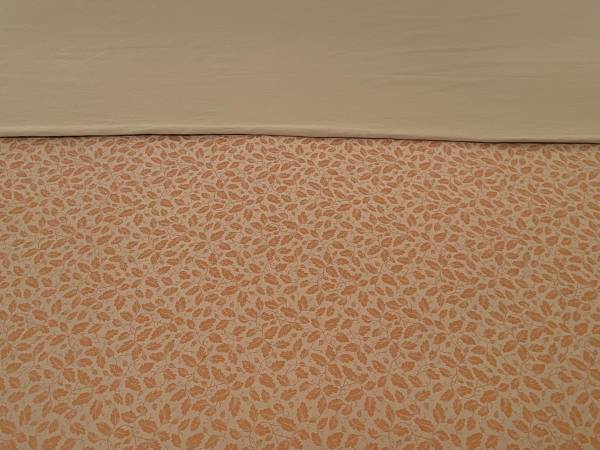 Inspired by Fall's refreshing crispness, her "Autunno" collection features a versatile, elegant golden orange small leaf pattern that looks like fine silk. The fabric was woven in Italy with pretty neutral colors that are versatile in design to add beauty to your bedroom the entire year. The backside of the duvet cover reverses to the background pattern color of solid light khaki tan. The 100% cotton king fitted sheet matches the duvet cover backside color. The King Duvet Cover measures 100"W x 90"L, and the King Pillow Shams each are 25" x 40" including a 3" border and an envelope back closure.