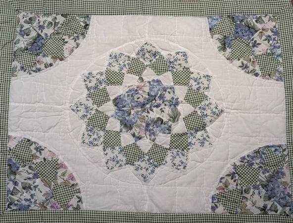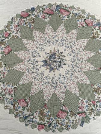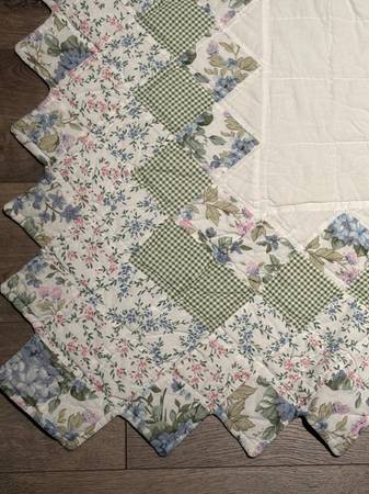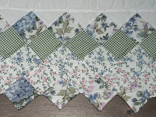 This 3-piece Full/Queen Bedding Set includes 1 Coverlet and 2 Matching Standard Pillow Shams. This classic farmhouse, cottage, and country-style aesthetic is popular in home decor now. Its pretty Tache quilt has a sawtooth perimeter for a unique vintage-inspired design. The background is white and the patterns feature floral colors of periwinkle blue, dusty rose, and sage green gingham checks. There are 4 different fabrics sewn in diamond rows for the border along with the large circle medallion in a starburst pattern in the middle. The 100% cotton coverlet is lightweight with polyester fill--perfect for all-season use. It is constructed well with all stitching and batting in tack. It is reversible to a white backside.