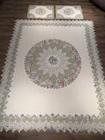 Dimensions: Full/Queen size bedspread/quilted coverlet 82" x 100", standard shams 20" x 26" each. The shams have backside envelope openings to insert the pillows.