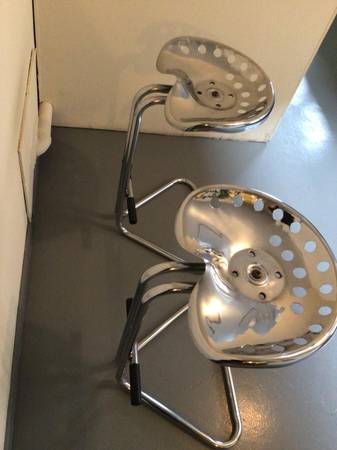 VINTAGE CHROME TRACTOR SEAT BAR STOOLS PAIR. IN THE STYLE OF RODNEY KINSMAN. MEASUREMENTS:H: 30.5” x W: 20.75” x D: 16.75” AGE / ORIGIN:1980's / Unknown Materials: Chrome CASH ONLY.