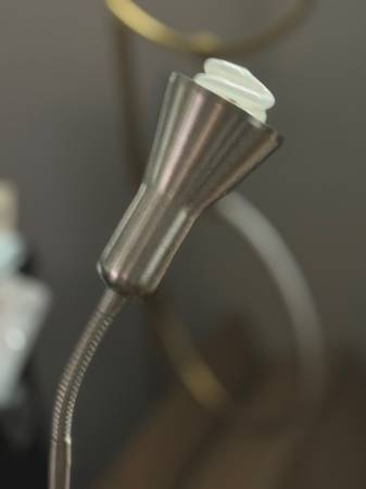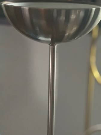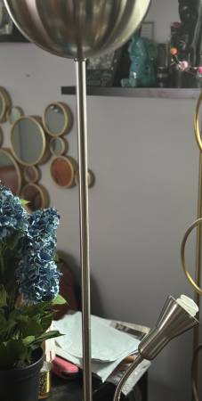 Selling a silver floor lamp that comes with an adjustable reading light. It has a bowl-shaped shade and a circular base. There are some signs of wear on the base.