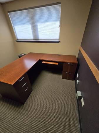 Retiring doctor, selling custom made L-Shaped desk by OFS. Fine wood craftsmanship and modern touches with a design language that transcends current trends. Original price $5,500, selling for $550.00, OBO Entire office professionally planned by interior designer.