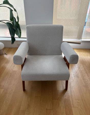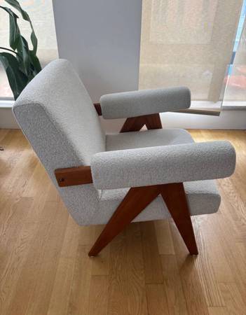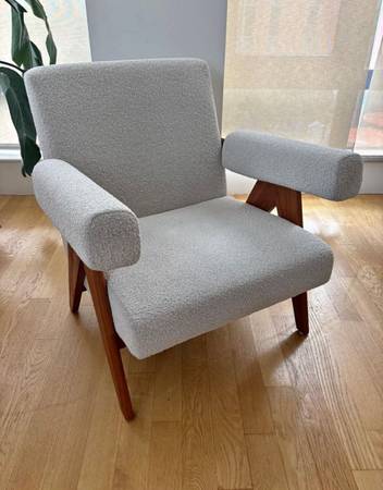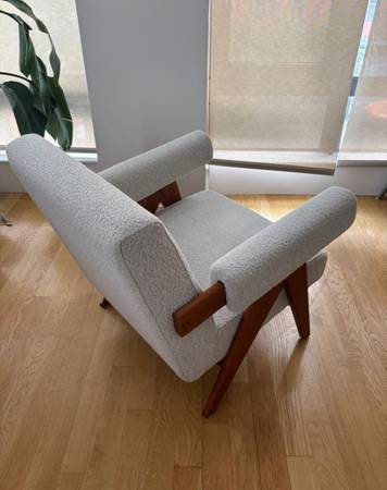 Pierre Jeanneret–style lounge chair from Industry West, upholstered in white bouclé fabric. Excellent condition — no stains or marks, gently used and well cared for.
