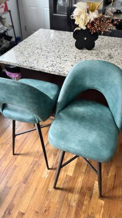 Fashion and function come together with these Metal Swivel Bar Stools (Set of 2). Featuring PU leather upholstery, sturdy metal legs, and a convenient swivel feature, casual dining with friends has never been comfier. These stools radiate mid-century modern vibes with their half-circle cutouts and thin, black finished legs. Perfect for contemporary or transitional design styles, this set completes any countertop or Bar height table.