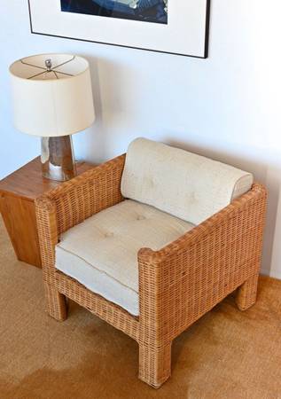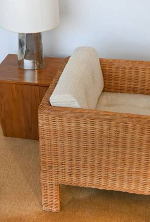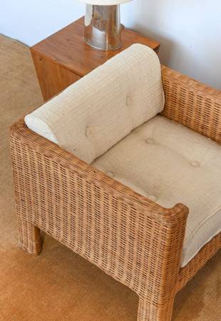 A few minor breaks to the wicker, consistent with age. Upholstery is clean, and the interior foam remains soft and comfortable. Overall good and sturdy condition