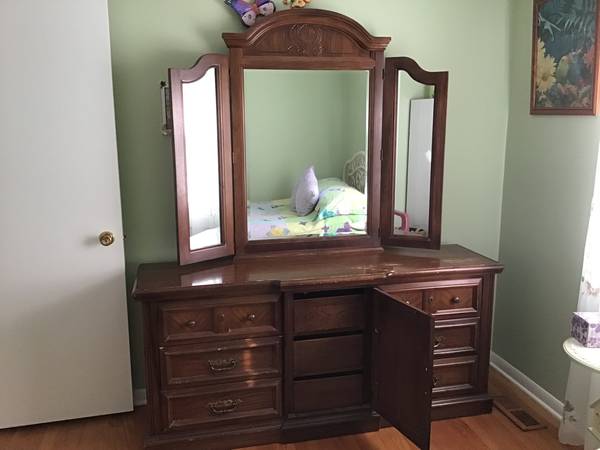 Dresser with attached mirror does have some nicks on it. It measures approx. 31”H x 68” W x18” D