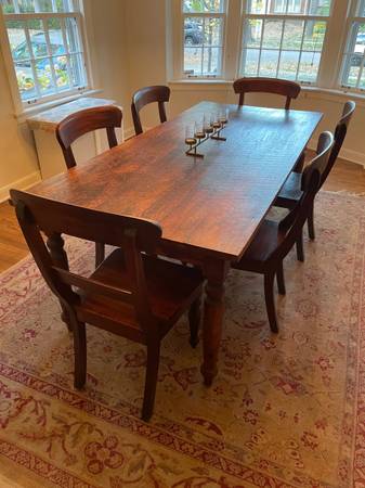 Solid wood table with distressed finish. 82" x 38" x 30.5"h, Excellent condition. With 6 chairs