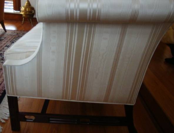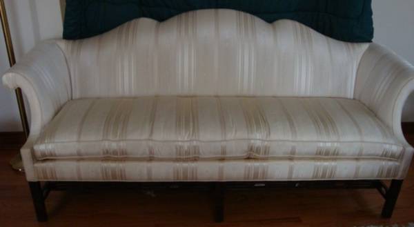 SOUTHWOOD TRIPLE CAMELBACK SOFA - ELEGANT 1760 ENGLISH CHIPPENDALE DESIGN - classic and striking with a serpentine back - solid Honduran mahogany wood + white on white stripe + beautiful silk brocade + comfortable down seat cushion - 18th century style - high quality MC construction - 73"W x 31.5"D x 38"H - 19" seat height and arms 31"H - like new condition - $1,270