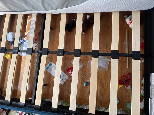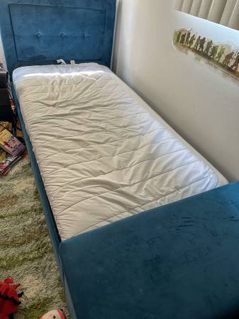 Twin bed frame with blue velvety material and attached storage chest Bed only, mattress not included Good condition - some minor stains that may come out with spot clean $150 obo