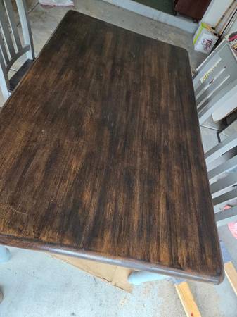Sturdy farmhouse style wood table and 4 matching wood chairs. The legs detach from the table (unscrew nuts) for easy transport. Chaise is included for free. Cash only.