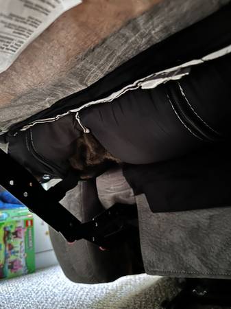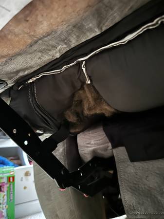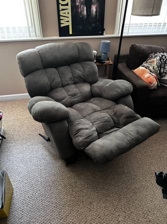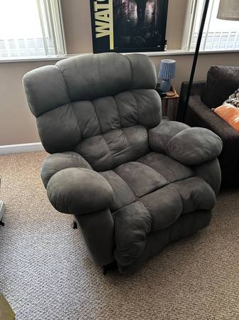 Recliner chair. Overall great shape for its age. Only issue is broken zippers on the bottom of foot rest allow cushioning/stuffing to fall out (seen in photos). Can be fixed with sewing or other fabric sealing