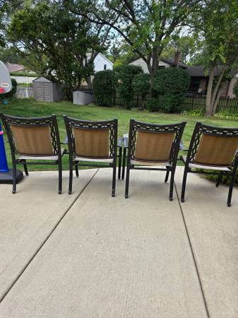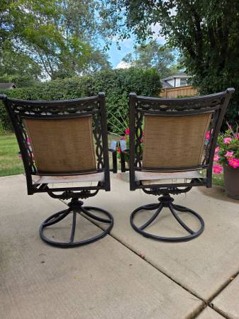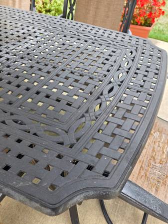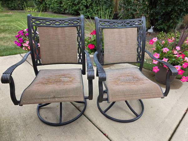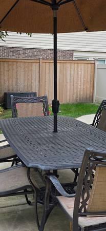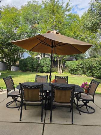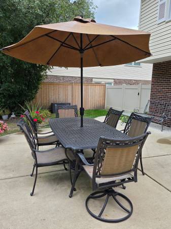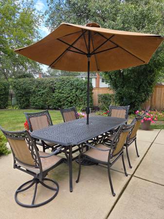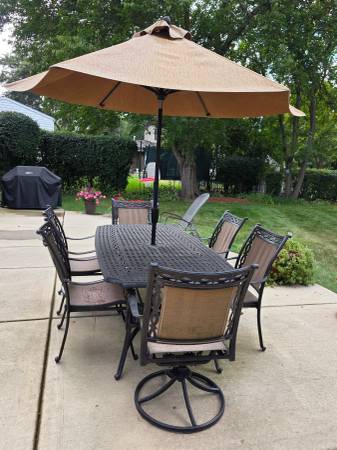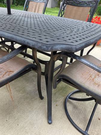 Outdoor patio dining set Metal sturdy well made Used condition shows signs of use and wear Table 42”x 84” Lattice tabletop 4 chairs and 2 swivel chairs For buyer to decide to replace cloth Umbrella...
