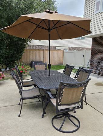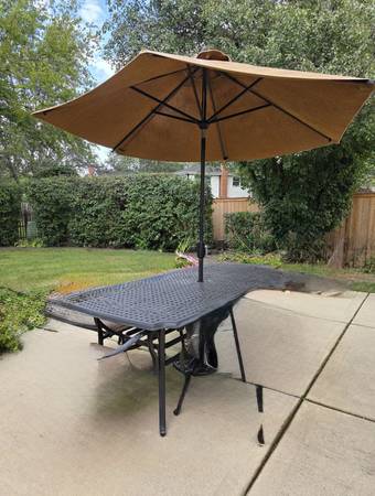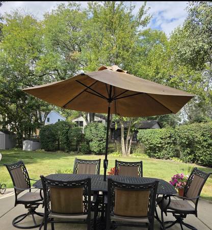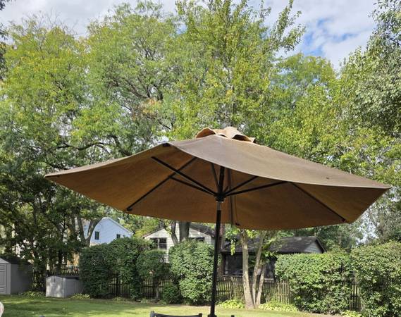 Outdoor table umbrella 9 ft Tan brown Vented top Good used condition Sturdy Functional condition Glenview pickup