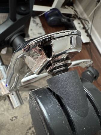 Selling a used office chair. One of the wheels broke off that is welded. The chair stands on 4 of the wheels no problem. This can be fixed with a little bit of effort.