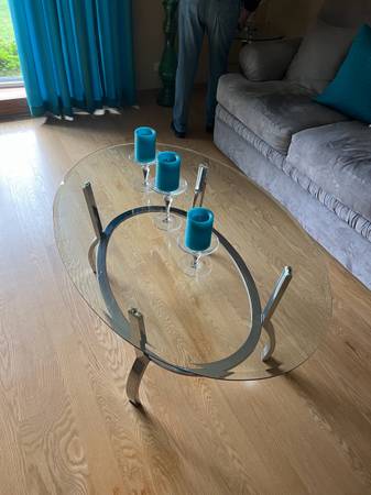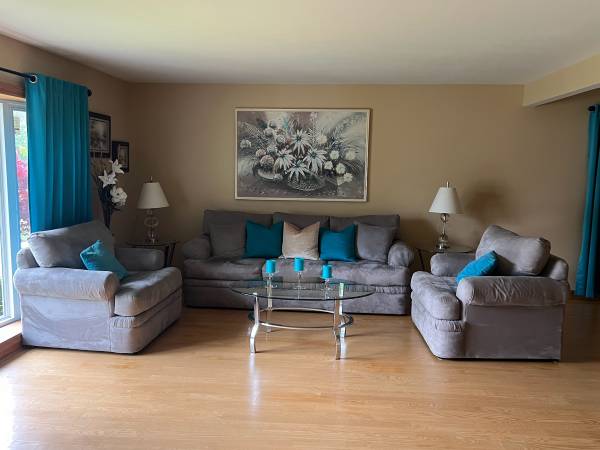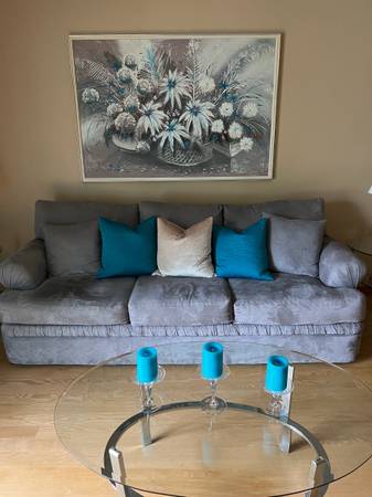 Sofa with two chairs three tables 2 lamps very good condition $850. Cash only