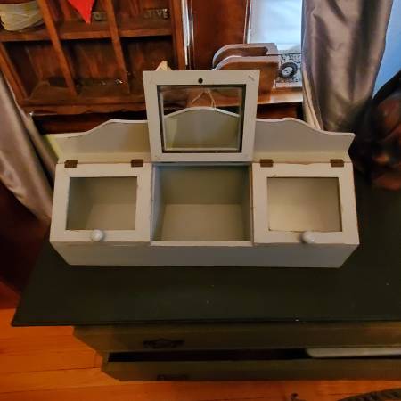 nice gray wood glass 3 compartment storage 23 x 7 x 10 --$10-----------2 wood shutters 18 x 52 great for display 1 nick in front of one $40 for the pair in skokie