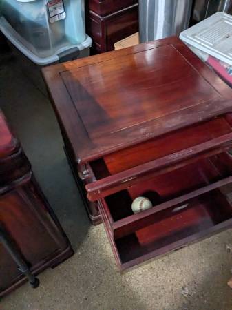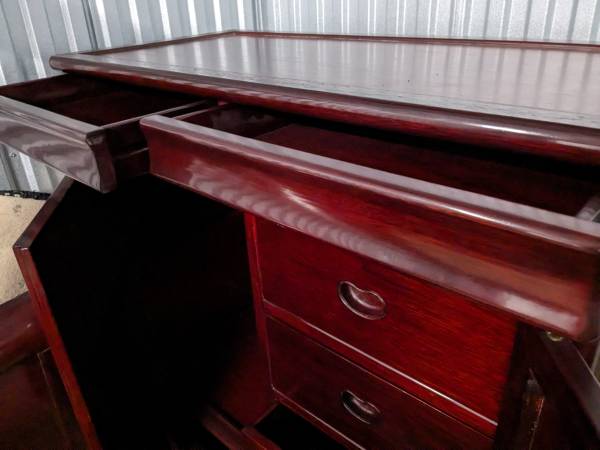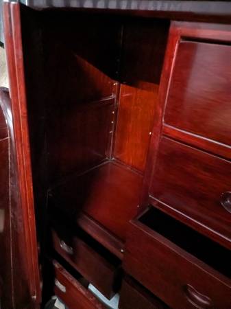 Handmade Rosewood, quality crafted Armoire, dresser, Queen bed frame, headboard, side boards and footboard. Like new.