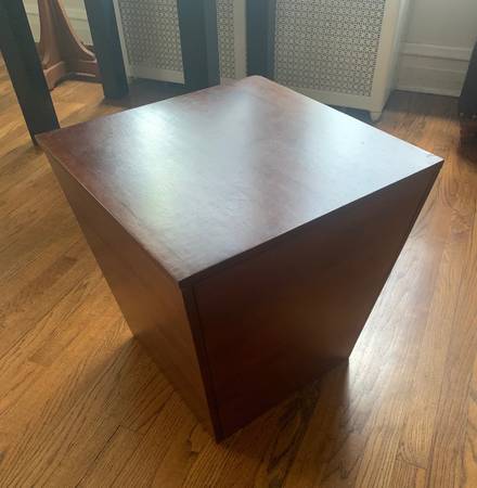 Stylish Wood End Side Table Nightstand with removable lid for storage. Trapezoid shape. Minor wear on top. 18.5x18.5x18.5 $25 cash only.