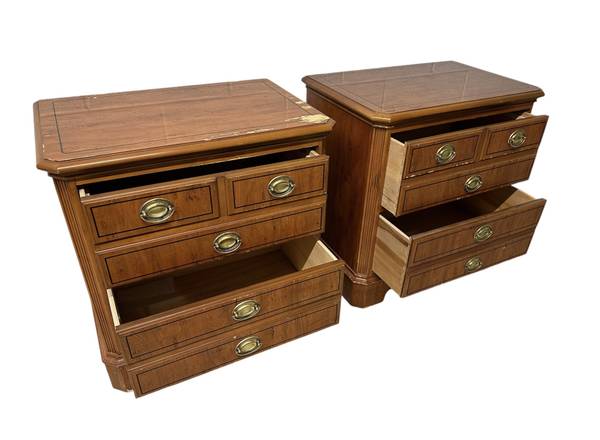 Pair of vintage Drexel nightstands. Made in USA. Sturdy construction/heavy but they need refinishing. Visible damage/wear to the veneer but nothing that can't be fixed. Pickup in Northfield Delivery...