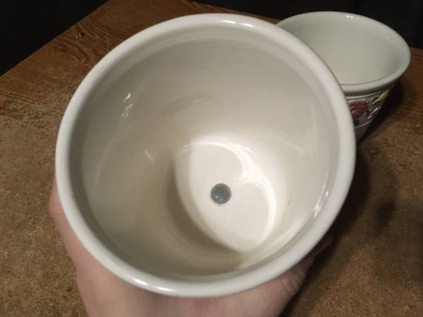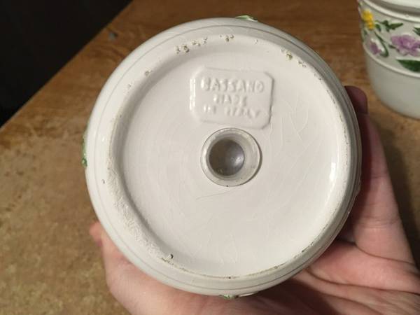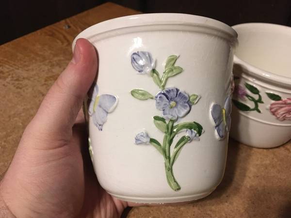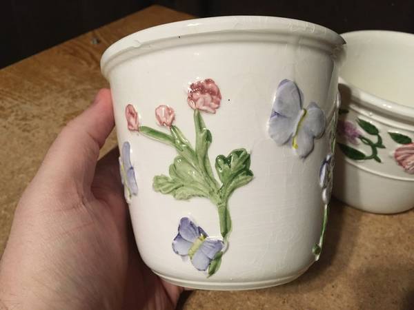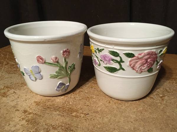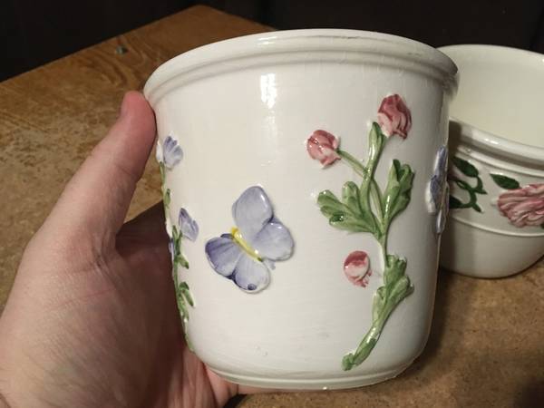 CASH ONLY TWO BASSANO PORCELAIN CERAMIC PLANTER POT ITALY 4.5" X 5" FLOWERS BUTTERFLY BOTH IN GREAT CONDITION, HAS CRAZING