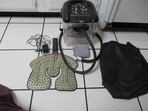 Ice or frozen water bottles are added to the hopper, fill with water and attach bladder to affected area with Velcro enclosure. Electric pump circulates water through the bladder to reduce swelling.