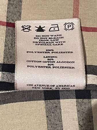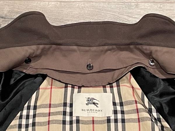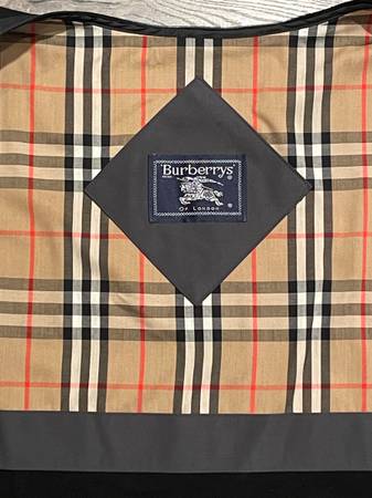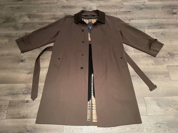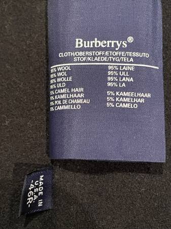 Outer shell material is a water-resistant polyester, and inner plaid lining is a comfortable cotton blend. The removable black liner is made of 95% wool and 5% camel hair to provide added warmth during cooler weather. Features a button-front closure, 2 different collars with plaid print on the underside, functional side pockets, and adjustable button cuffs for a tailored fit. This coat is labeled "Burberrys of London", which indicates it was made before the company rebranded to "Burberry".