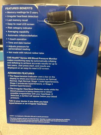 Brand new in box CVS Blood Pressure Monitor. Memory reading for 2 users, Irregular heartbeat detection, Easy to read LCD screen, Time and date tracker. Pick up or meet at safe, convenient location....