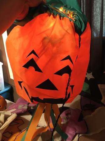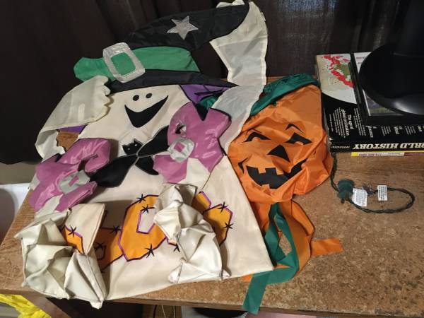 CASH ONLY JACK-O-LANTERN HAS ABOUT AT 3.5 FOOT CORD GOOD CONDITION. FLAG IS FADED/DIRTY WAS USED OUTSIDE, ONE FOOT WAS RIPPED AND TAPED. IT'S ABOUT 45-46"