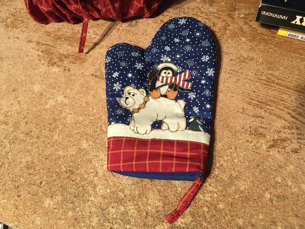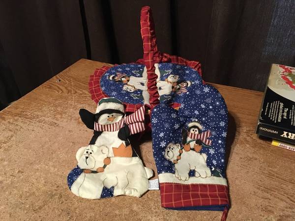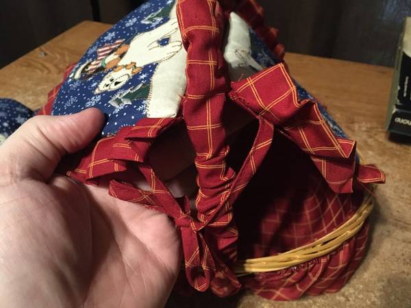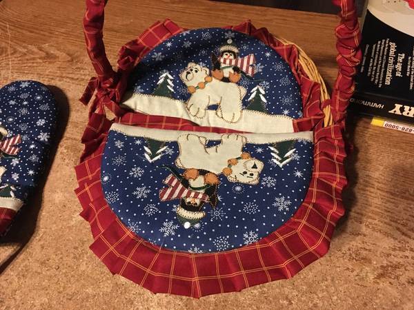 CASH ONLY HOLIDAY WOVEN WICKER & CLOTH BASKET OVER MITT POT HANDLE PENGUIN DIANNA MARCUM VERY GOOD CONDITION, USED AS A DECORATION. ABOUT 9 1/2" X 8"