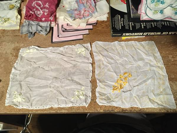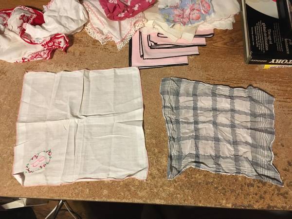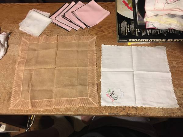 CASH ONLY MOST ARE IN GOOD CONDITION, SOME HAVE SMALL STAINS ON THEM,THE RED FLOWER ONE HAS A WHITE MARK ON IT. THE BLACK AND PINK ARE NAPKINS THE REST ARE HANDKERCHIEFS THEY ARE MADE OF COTTON AND...