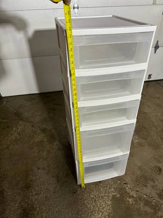 This listing is for 5 white plastic modular stacking drawers. There are 3 short ones and 2 tall ones. Still in good shape. They have been stored in my garage, so they will need to be wiped down. See approximate dimensions below: