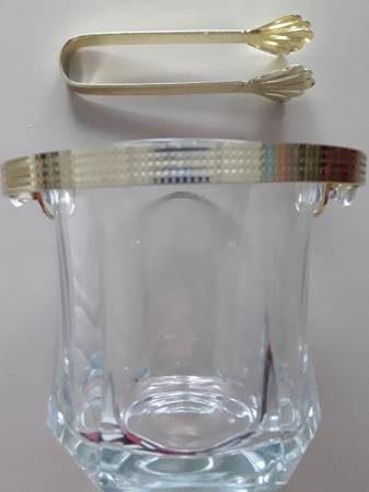 CLEAR GLASS ICE BUCKET (5" diameter, 5.25" height) with metal handle and tong (6" length) - accessory for party cocktails etc. - bar + kitchen + dining room + barbecue / BBQ - new - $17 accessories...