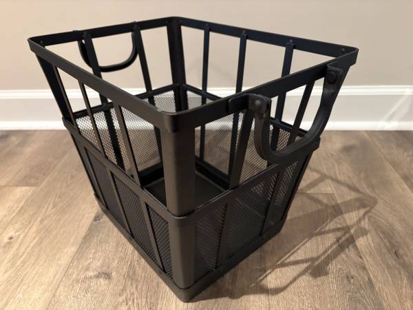 Heavy duty black wrought iron firewood basket. Designed to be functional for holding logs with its open mesh design to allow air circulation to help dry out wood for burning and prevent mold. The sturdy construction and handles on both sides make it easy to transport firewood. The modern, rectangular design looks great near a fireplace, wood stove, or for other uses for storage and home decor.
