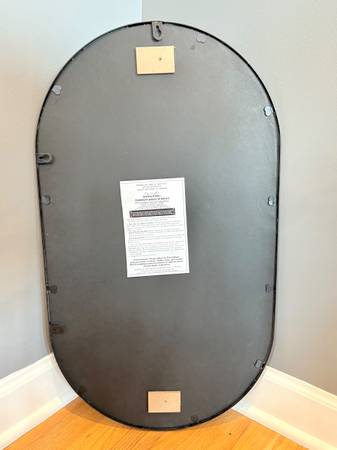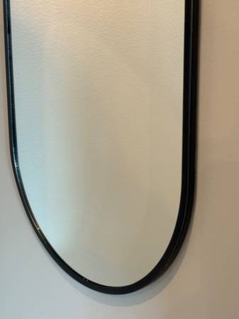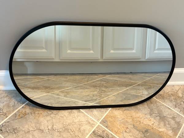 This NEW satin black metal framed oval/oblong, racetrack/pill capsule-shaped mirror is sleek and minimalist in design. A versatile mirror that can be hung in a bathroom, bedroom, living room, entryway, mudroom, etc. as it can complement many interior design styles. Not only highly functional, but aesthetically pleasing! The mirror can be hung vertically or horizontally with built in hanging hardware on the backside.