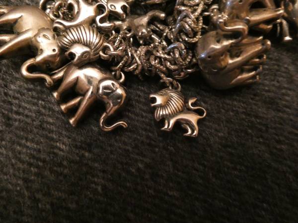 Silver metal multi charm safari animal bracelet. Possibly pewter. 38-40 charms , lions, giraffes, elephants, panthers. Recently restrung with new clasps. Interesting item for animal lovers. 7 " long.
