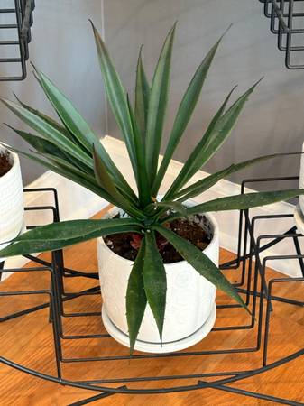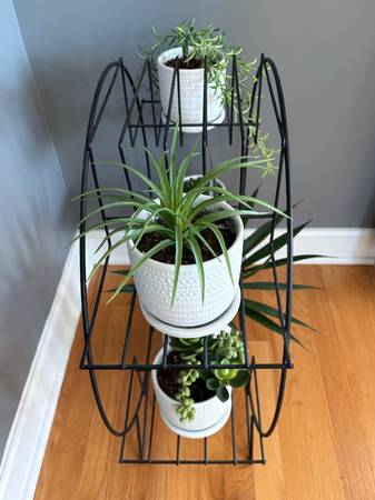 The live flowering cactus plant shown at the top in the 1st photo only is not included. This vintage plant stand with 5 plants in pots are $170 cash total.