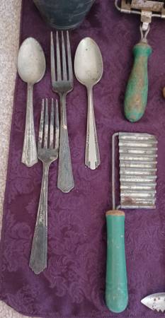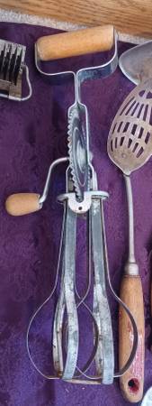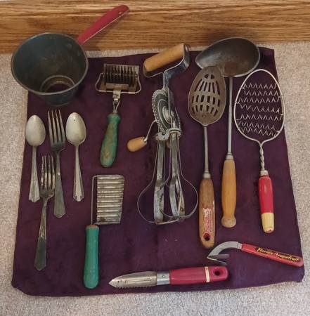 Vintage 1940's/1950's kitchen hand tools, all for $40 or buy separately. Slotted spoon 11.5 inches long $3. high-speed beater Made in USA 12.5 inches long $9. Deerfield silver plated 2 forks and 2 spoons, 4 for $5. Serving ladle 12 inches long $3. Hand food whipper 10 3/4 inches long $5. Fruit corer, vegetable slicer $3. Pastry crimper $7. Florida grapefruit/orange peeler $5. Nessco five articles in one (strainer, fruit jar filler, funnel,measure,and dipper) $8. Near Fairfield Road and Chardon Road in Unincorporated Grayslake.