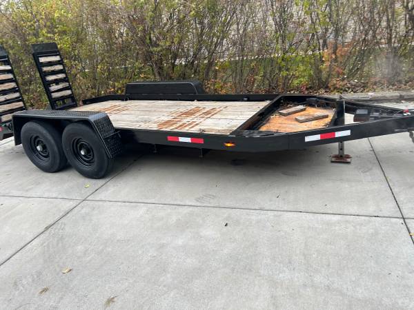 Selling my trailer 16x7 Inside deck measures 74”x 14’ dove tail 2’ Good trailer everything works Good lights tires, and brakes Pintle hitch, 7 pin connect Clean title GVWR 12k Call or...