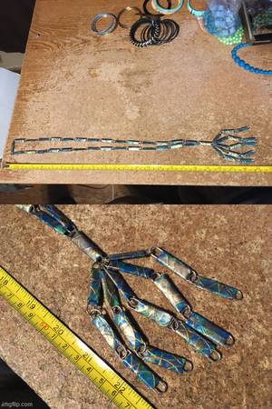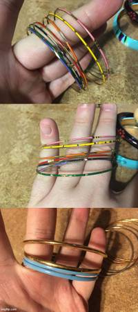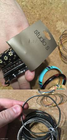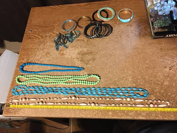 CASH ONLY VERY GOOD CONDITION, SOME OF THE LONG BEADED ONES ARE FROM THE 60'S THERE'S A PAPER NECKLACE, THICK AND THIN BRACELET, STUDIO S ONE IS BENT, SHOWN LAST PICTURE