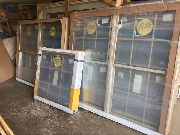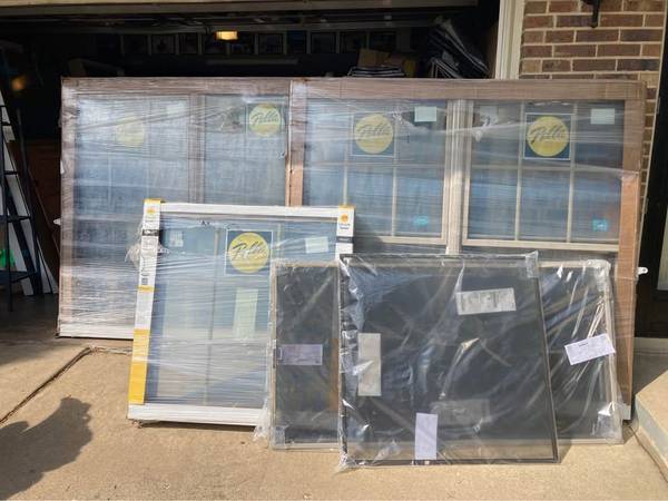 New Pella Lifestyle double hung and casement windows , fossil aluminum exterior , stained wood interior , grids are in between glass - not removable , have nail flanges , missing two screens , 68 by 63 3/4 by 4 9/16 jamb and 40 by 40 . All for $2450