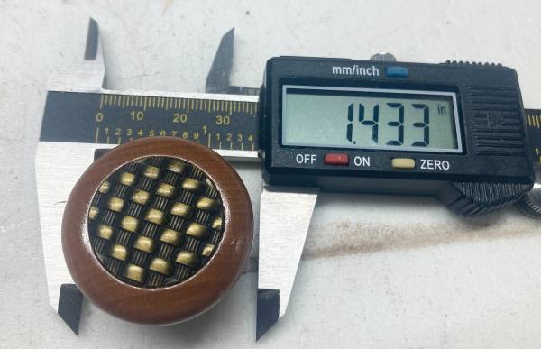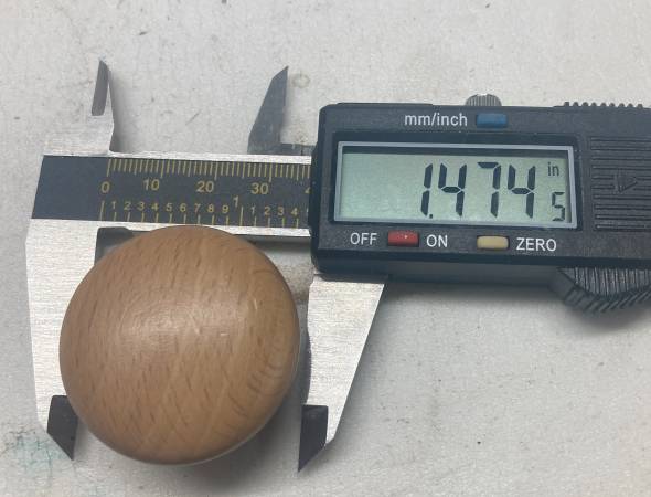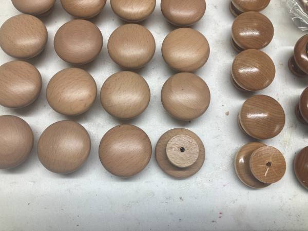 I have 47 wooden drawer knobs/pulls. They measure approximately 1.5" diameter and about 1" tall. See photos for actual measurements. Some pulls are solid wood (Maple?), and eleven have a metal...